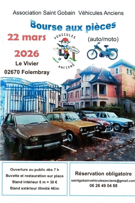 La 11ème Bourse d’échanges d’Hiver se tiendra à Folembray, une charmante localité située au sud de Saint-Quentin. Cet événement est un véritable rendez-vous pour les passionnés d’automobiles et de motos anciennes, offrant une vaste sélection de pièces détachées, d’accessoires, ainsi que de la documentation spécialisée. Les visiteurs auront également l’occasion d’admirer une exposition de véhicules anciens, mettant en avant des modèles qui ont marqué l’histoire de l’automobile et de la moto.